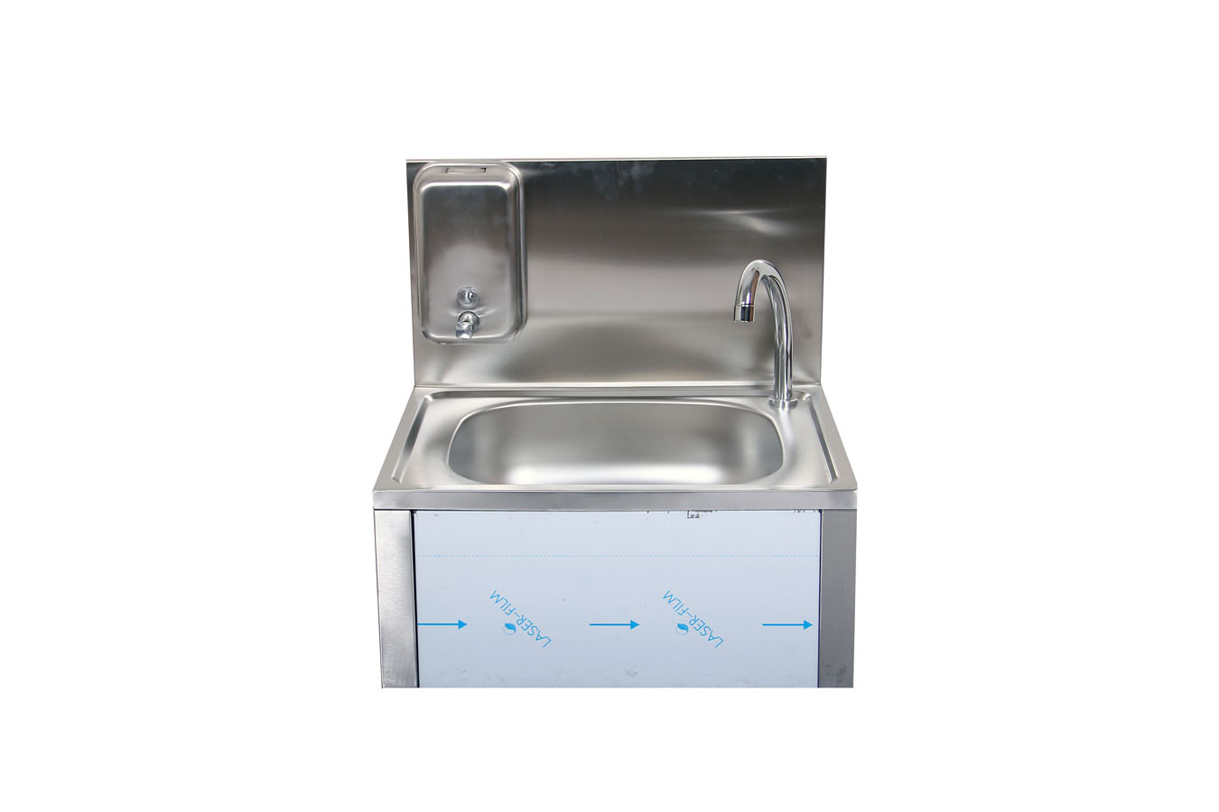 The knee-controlled sink is a one-to-one solution for personal hygiene. The sink has a unique ergonomic design and provides non-contact hand washing with knee control, minimizing the risk of infection. The sink, faucet, and soap dispenser are completely made of stainless steel.